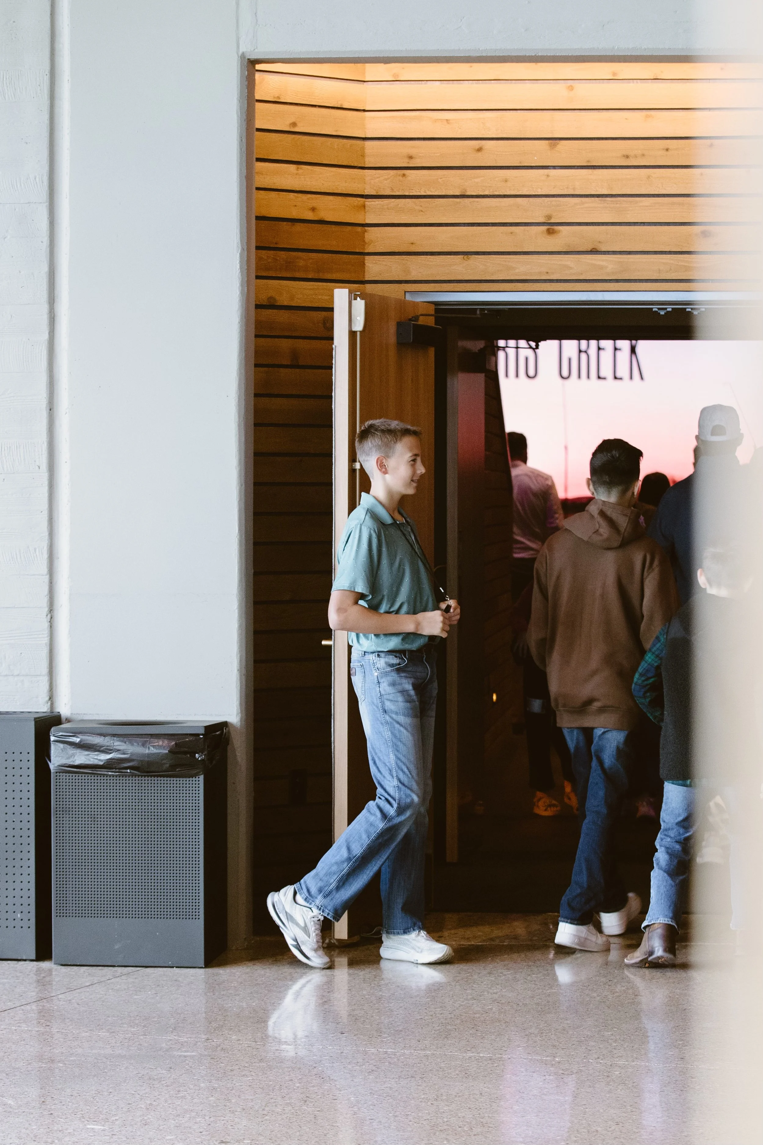A young boy joyfully serving and welcoming others into Sunday service, already living out what it means to lead with kindness, generosity, and a heart for God.